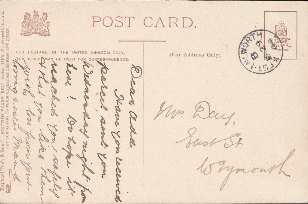 1904 UNPAID MAIL WEST LULWORTH TO WEYMOUTH. Fine post card West Lulworth to Weymouth, posted unpaid and cancelled fine WEST. LULWORTH date stamp MR 29 04 and without surcharge. (Ref 117182).