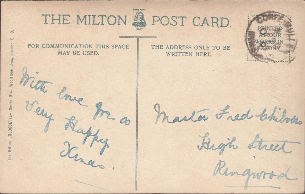 1907 UNPAID MAIL CORFE MULLEN TO RINGWOOD. Post card Corfe Mullen to Ringwood, posted unpaid and cancelled CORFE.MULLEN/WIMBORNE date stamp DE 20 07. Unsurcharged by the Post Office. (Ref 117183).