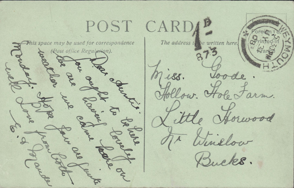 1908 UNPAID MAIL WEYMOUTH TO WINSLOW BUCKS. Post card Weymouth to Winslow Bucks, posted unpaid with fine strike WEYMOUTH date stamp JY 31 08 and '1D/873' charge mark of Weymouth. (Ref 117184).