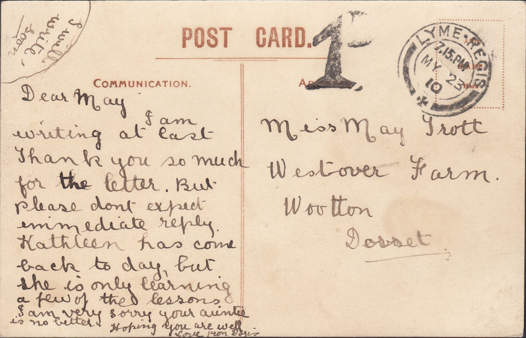 1910 UNPAID MAIL LYME REGIS TO WOOTTON DORSET. Post card Lyme Regis to Wootton Dorset, posted unpaid with fine strike LYME. REGIS date stamp MY 23 10, also '1D' charge mark of Lyme Regis. (Ref 117192).