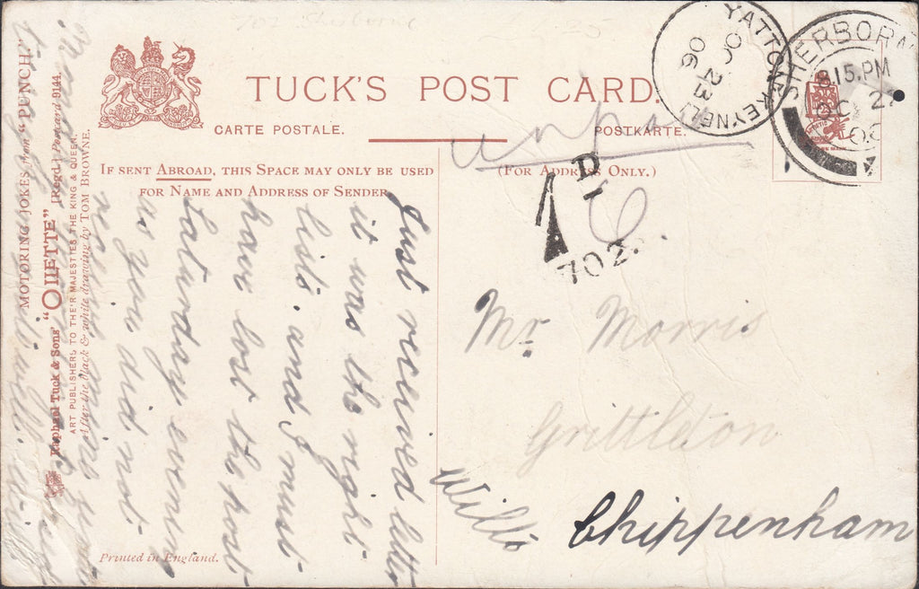 1906 UNPAID MAIL SHERBORNE TO GRITTLETON WILTS. Post card, some creasing from Sheborne to Grittleton Chippenham, posted unpaid and cancelled SHERBORNE OC 22 06. Manuscript 'unpaid' good strike '1D/702' charge mark of Sherborne and YATTON KEYNELL receiver OC 23 06. (Ref 117195).