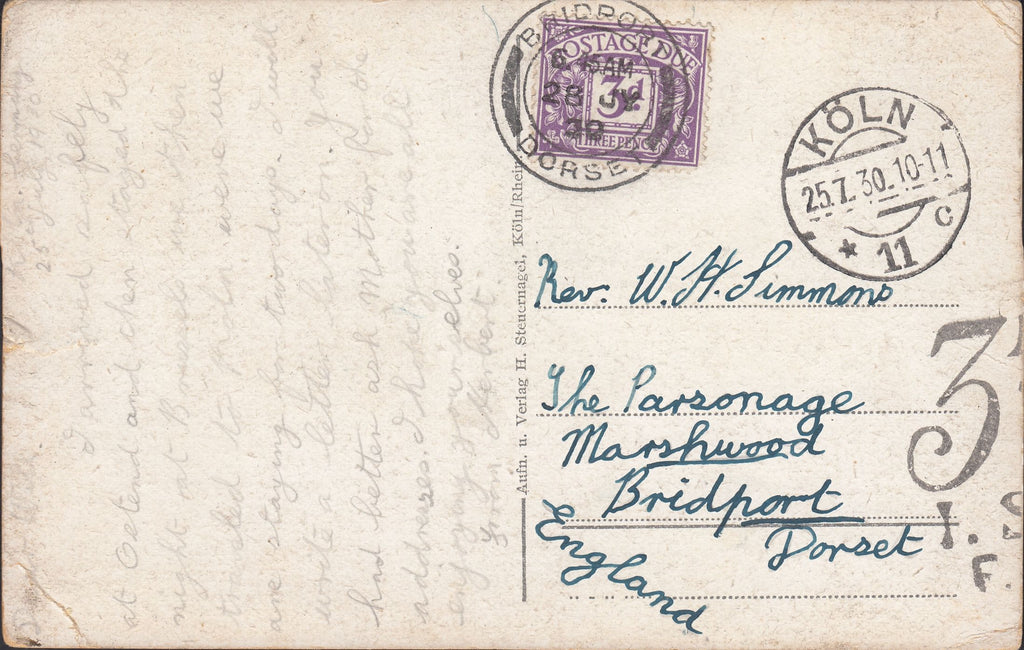 1930 UNPAID MAIL COLOGNE TO BRIDPORT. Post card, slight faults, Cologne to Bridport Dorset, posted unpaid with KOLN date stamp 25.7.30 and UK '3D' charge mark. 3d postage due affixed and cancelled BRIDPORT/DORSET date stamp 28 JY 30. (Ref 117482).