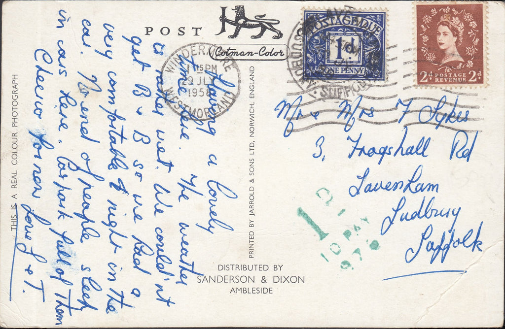 1958 UNDERPAID MAIL WINDERMERE TO LAVENHAM. Post card, corner crease, from Windermere to Lavenham Suffolk with 2d Wilding cancelled WINDERMERE/WESTMORLAND 29 JLY 1958. Postage underpaid with fine strike '1D/TO PAY/976' charge mark of Winderemere in green and 1d postage due cancelled LAVENHAM/SUDBURY.SUFFOLK date stamp 30 JY 58. (Ref 118051).