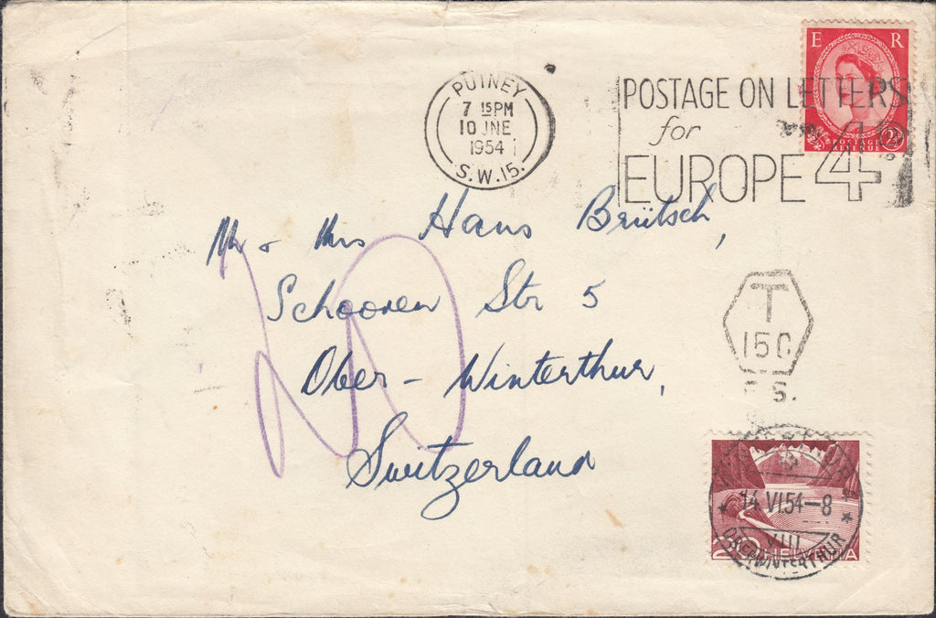 1954 UNDERPAID MAIL PUTNEY TO SWITZERLAND. Envelope Putney to Winterthur Switzerland with 2½d Wilding cancelled PUTNEY 10 JNE 1954, postage underpaid with tax mark and Swiss 20 postage due cancelled WINTERTHUR 14 VI 54. (Ref 118440).