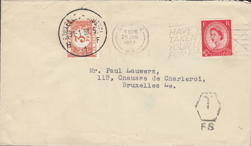 • 118442 1957 UNDERPAID MAIL CHISWICK TO BELGIUM.