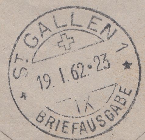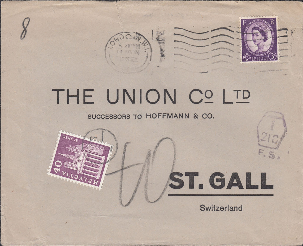 1962 UNDERPAID MAIL LONDON TO ST. GALL SWITZERLAND. Envelope, small tear at top, London to St. Gall Switzerland with 3d Wilding cancelled LONDON 18 JAN 1962, postage underpaid with tax mark and Swiss 40 postage due cancelled. (Ref 118449).