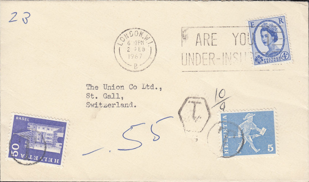 UNDERPAID MAIL LONDON TO ST. GALL SWITZERLAND. Envelope London to St. Gall Switzerland with 4d Wilding cancelled LONDON 2 FEB 1967, postage underpaid with tax marks and Swiss 5 and 50 postage dues cancelled 'T' hand stamps. (Ref 118699).