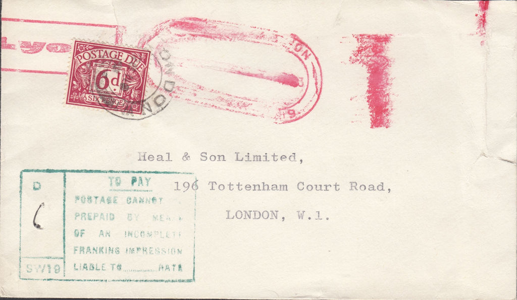 1963 SURCHARGED MAIL DUE TO INCOMPLETE FRANKING IMPRESSION. Envelope used locally in London with incomplete strike of franking impression, without value and franking machine has damaged envelope at right. On front fine strike charge mark '6D/SW19/TO PAY POSTAGE CANNOT BE PREPAID BY MEANS OF AN INCOMPLETE FRANKING IMPRESSION...' with 6d postage due cancelled LONDON date stamp 28 NO 63. (Ref 118756).