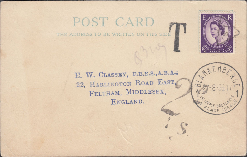 1955 MAIL BELGIUM TO ENGLAND/3D WILDING STAMP NOT VALID. Post card Blankenberge (Belgium) to Feltham Middlesex with 3d Wilding cancelled triangular 'L.S.' hand stamp, stamp not accepted for postage as invalid in Belgium with 'T' tax mark and UK '2D/I.S' charge mark in black. On front BLANKENBERGE date stamp 27 8 55. (Ref 118811).