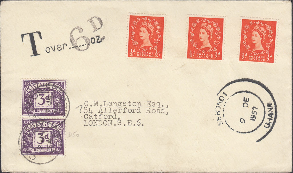 1957 MAIL GHANA TO LONDON/UK STAMPS NOT VALID. Envelope Ghana to Catford London with GB Wildings ½d x 3 affixed but not cancelled, not accepted for postage, alongside SEKONDI/GHANA date stamp 9 DE 1957 with 'T' tax mark and '6D' charge with UK 3d postage dues x 2 cancelled CATFORD date stamps 2 JA 58. (Ref 118818).