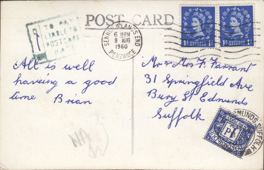 1960 UNDERPAID MAIL SENNEN AND LANDS END TO BURY ST EDMUNDS. Post card to Bury St Edmunds Suffolk with Wilding 1d x 2 cancelled SENNEN AND LANDS END/PENZANCE 9 AUG 1960, postage underpaid with '1D/TO PAY LIABLE TO POSTCARD RATE' and 1d postage due cancelled BURY ST EDMUNDS SUFFOLK 11 AUG 60. (Ref 118852).