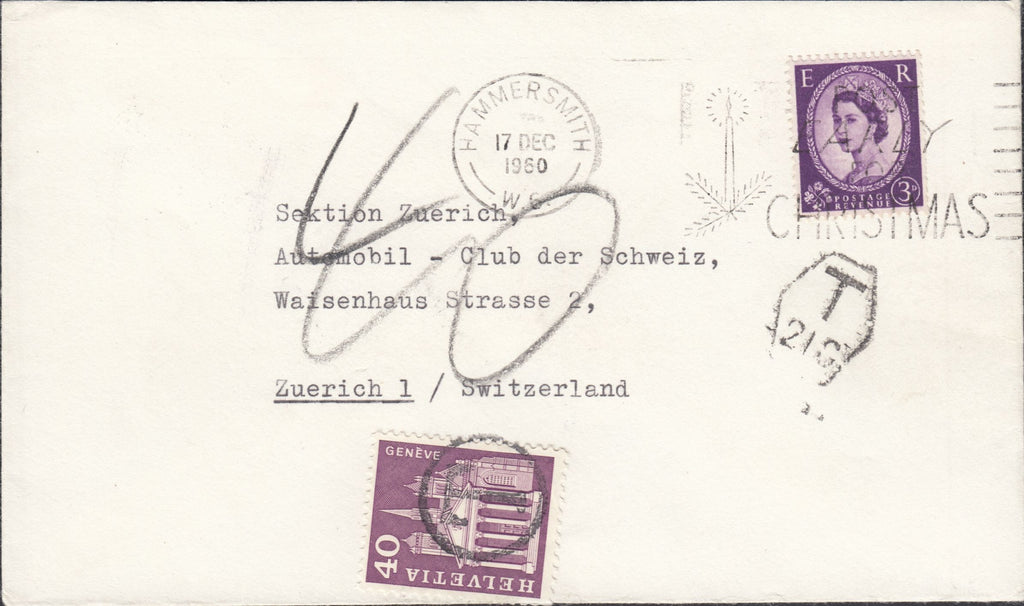 1960 UNDERPAID MAIL HAMMERSMITH TO ZURICH. Envelope Hammersmith to Zurich Switzerland with Wilding 3d cancelled HAMMERSMITH 17 DEC 1960, postage underpaid with Swiss postage due cancelled 'T' tax mark. (Ref 119546).