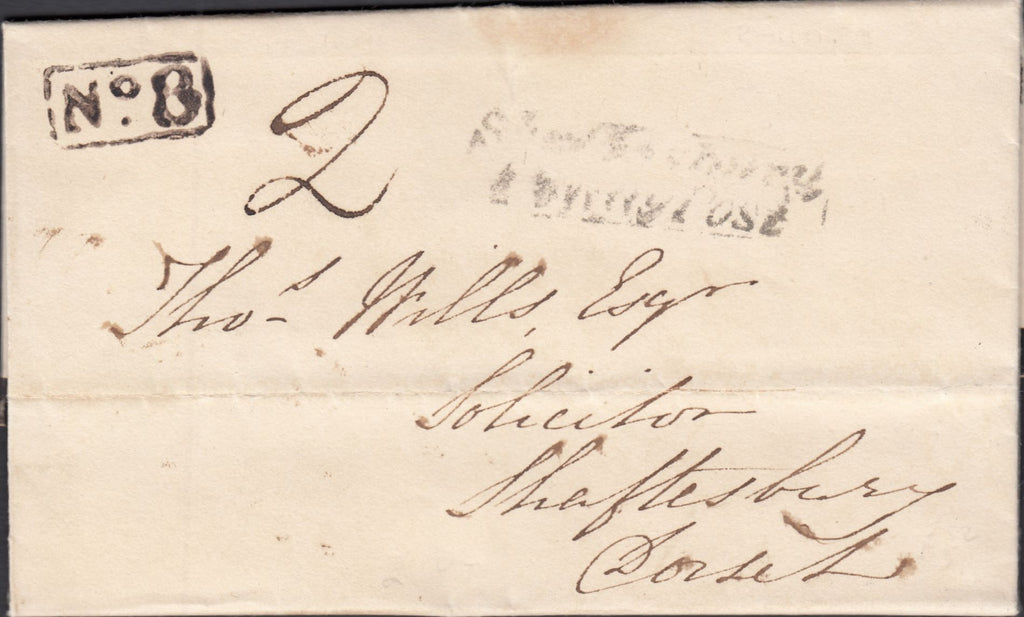 1833 DORSET/'SHAFTESBURY PENNY POST' (DT458). Fine mourning wrapper Henstridge to 'Thos. Wills Esqr Solicitor Shaftesbury Dorset' dated Oct 20 1833 and charged '2'. On front light strike boxed 'Shaftesbury/Penny Post' hand stamp in black (DT458) and very fine strike boxed 'No.8' receiver's hand stamp of Henstridge in black. Filing fold. (Ref 119590).