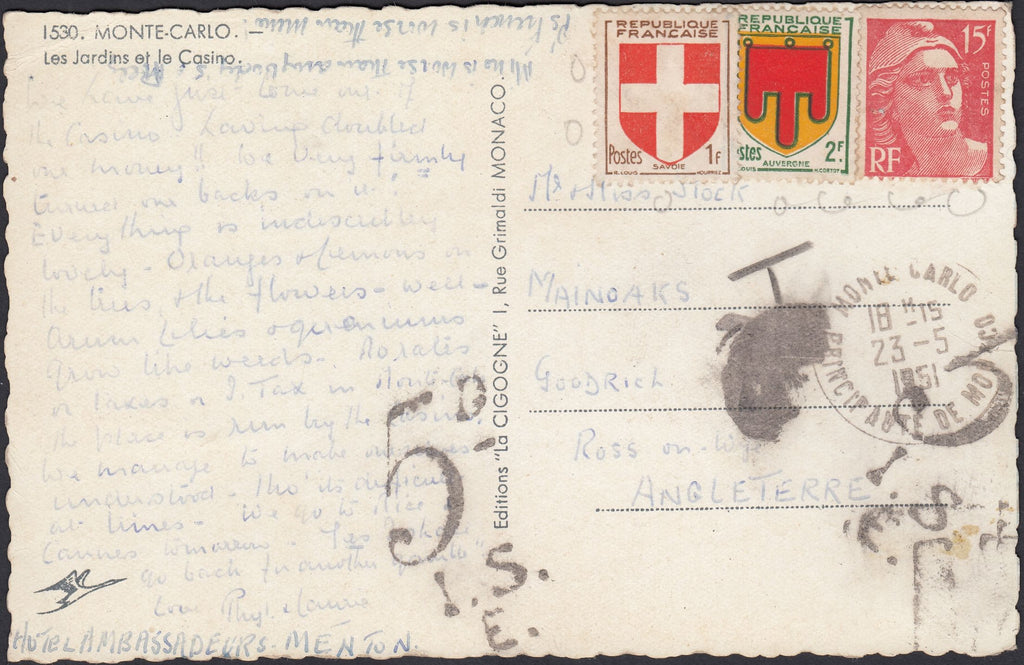 1951 MAIL MONTECARLO TO ENGLAND, POSTAGE DUE 'INVALID STAMPS'. Post card from Monte Carlo to Ross on Wye, England with French stamps affixed which were invalid for use in Monte Carlo, with MONTE CARLO date stamp 23 5 51 struck below. Also '5D/I.S.' UK charge mark although no charge appears to have been collected. (Ref 126373).