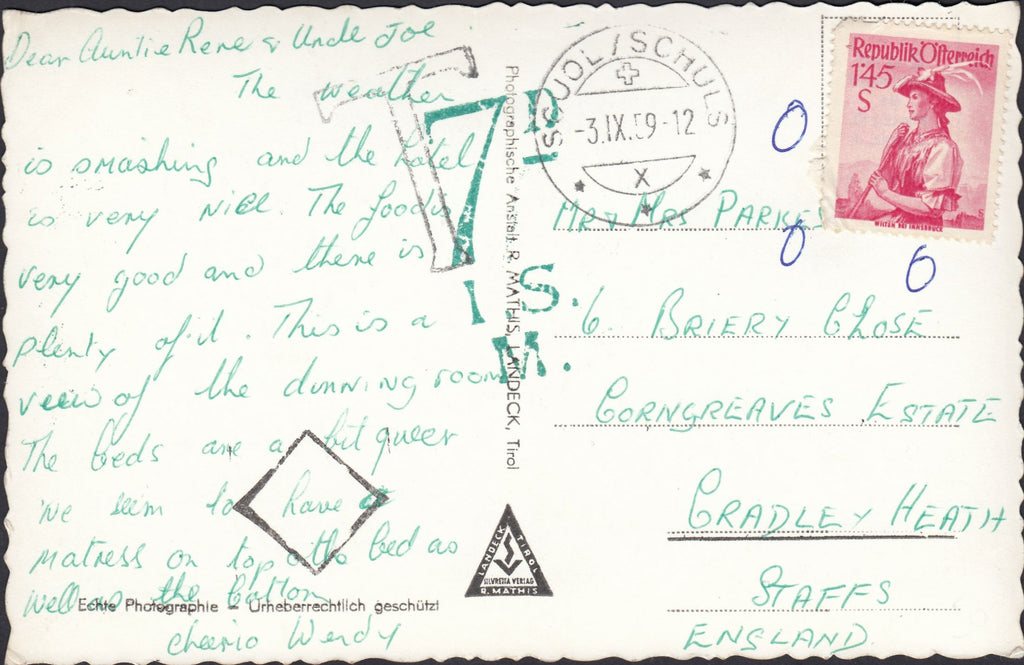 1959 MAIL SWITZERLAND TO STAFFS, ENGLAND, SURCHARGED DUE TO 'INVALID STAMP'. Post card from Switzerland to Cradley Heath, Staffs with Austrian stamp affixed but not valid for postage and alongside 'SCUOL/SCHULS' date stamp 3 9 59 with 'T' tax mark and London '7D/I.S.' charge mark in green. (Ref 126380).