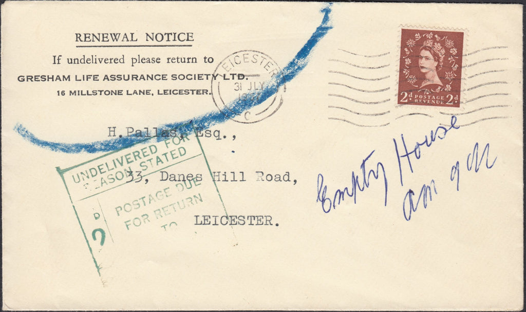 1957 MAIL USED IN LEICESTER, UNDELIVERED WITH MANUSCRIPT 'EMPTY HOUSE'. Envelope used locally in Leicester with 2d Wilding cancelled 'LEICESTER' 31 JLY 1957 with manuscript 'Empty House' and boxed 'UNDELIVERED FOR REASON STATED/2D/POSTAGE DUE FOR RETURN TO SENDER' hand stamp. (Ref 129804).