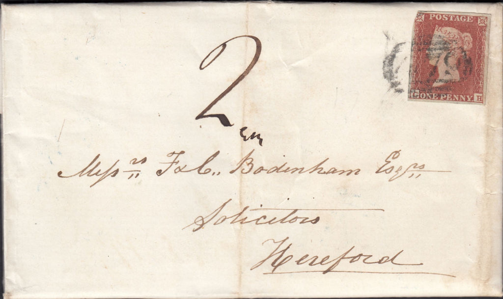 1852 UNDERPAID MAIL BRAMPTON BRYAN TO HEREFORD WITH 'BRAMPTON-BRYAN' UDC (HF14). Letter from Brampton Bryan in Herefordshire to 'Mefsrs. F and C Bodinham Esqrs., Solicitors, Hereford' with 1d (SG8) lettered CH, touched at upper left otherwise good margins and tied good strike '479' numeral of Ludlow. Postage underpaid with manuscript charge '2' on front, on reverse light strike of the scarce 'BRAMPTON-BRYAN' udc in black (HF14) and 'LUDLOW' date stamp in blue SP 10 1852. (Ref 131595).