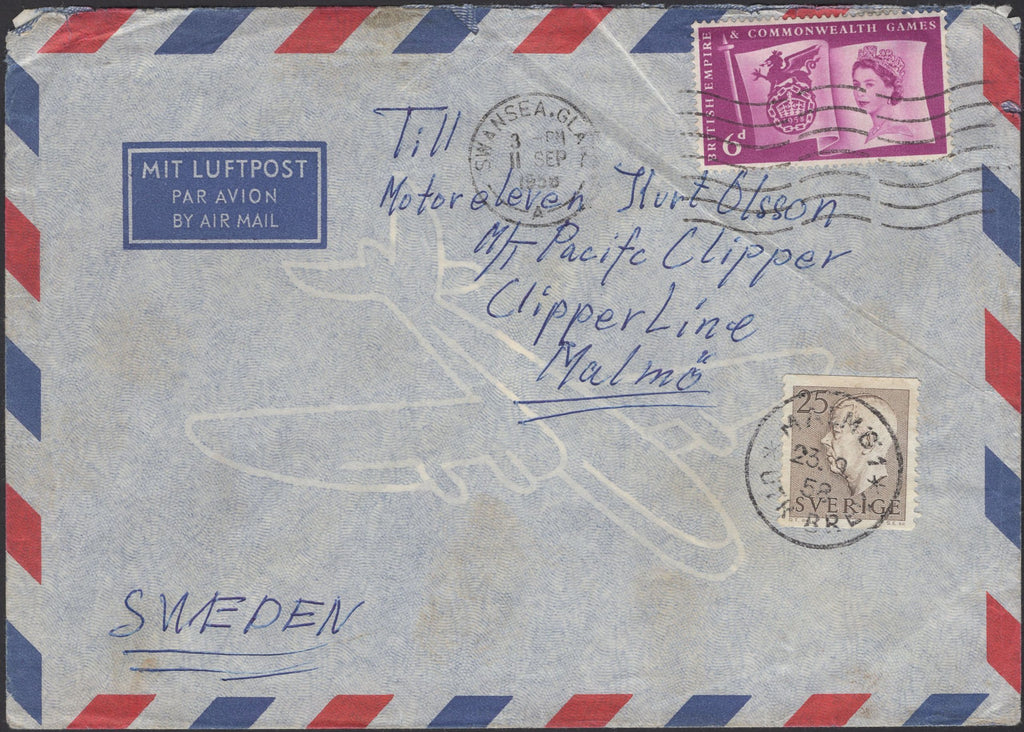 1958 UNDERPAID AIR MAIL SWANSEA TO MALMO, SWEDEN WITH SWEDISH POSTAGE DUE. Air mail envelope Swansea to Malmo, with 6d Commonwealth Games (SG568) cancelled 'SWANSEA' 11 SEP 1958, postage underpaid with Swedish 25 Ore postage due cancelled 'MALMO' 23 9 58. Unusual commercial mail. (Ref 139793).