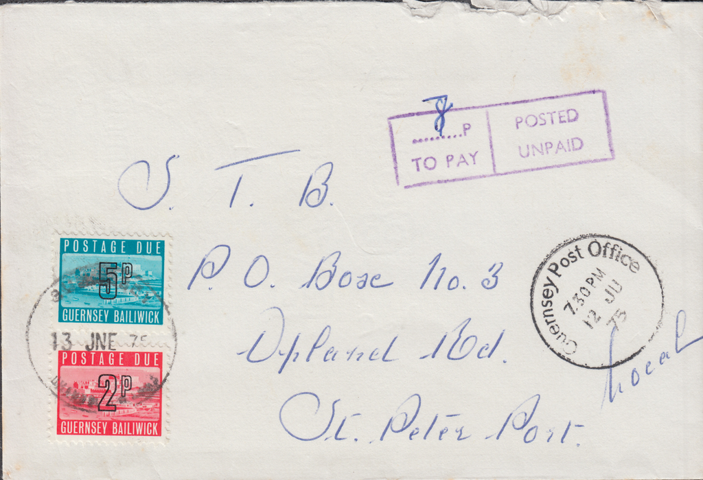 1975 envelope used locally in Guernsey with postage unpaid and Guernsey datestamp 12.JU.75. Boxed "7P TO PAY/POSTED UNPAID" chargemark and Guernsey 2p and 5p dues added, cancelled 13.JNE.75.  (Ref 77604).