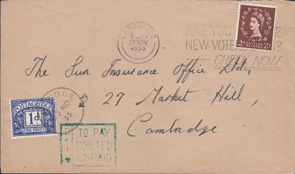 1955 UNDERPAID MAIL USED IN CAMBRIDGE. Envelope used locally in Cambridge with 2d Wilding cancelled CAMBRIDGE 29 NOV 1955 with boxed "1d" chargemark and 1d postage due cancelled CAMBRIDGE 30 NO 55. (Ref 80571).