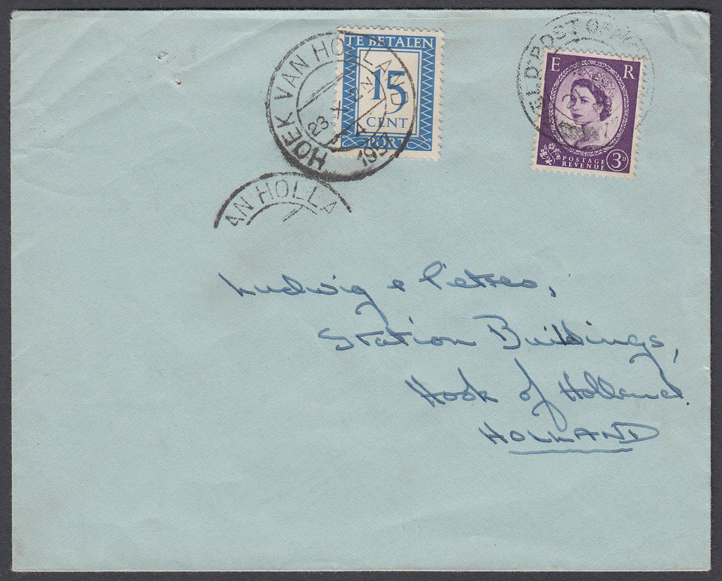 1957 envelope to Holland with 3d Wilding cancelled FIELD POST OFFICE 21 OC 57, postage underpaid with Dutch 15c postage due cancelled HOEK VAN HOLLAND 23 10 1957.  (Ref 80605).