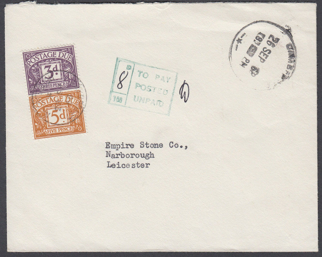 1968 UNPAID MAIL. Envelope Cambridge to Narborough, Leicester, postage unpaid with CAMBRIDGE datestamp 26 SEP 68 and "8d/TO PAY POSTED UNPAID" chargemark of Cambridge with 3d and 5d dues cancelled NARBOROUGH 28 SE 68.  (Ref 80634).