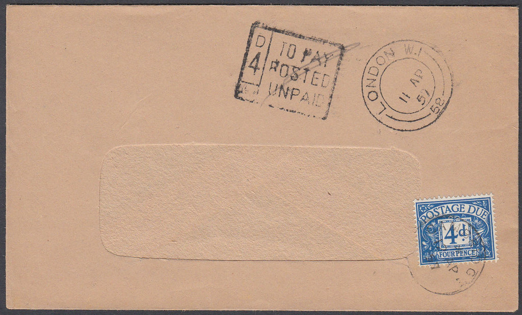 1957 UNPAID MAIL. Window envelope London to Cambridge, postage unpaid, cancelled LONDON 11 AP 57 with "4D/TO PAY POSTED UNPAID" chargemark and 4d due cancelled CAMBRIDGE 12 AP 57. (Ref 80667).