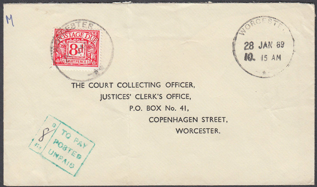 1969 UNPAID MAIL/WORCESTER. 1969 envelope used locally in Worcester, postage unpaid, with WORCESTER datestamp 28 JAN 1969 with boxed "8D/TO PAY POSTED UNPAID" with 8d due cancelled WORCESTER 29 JAN 69. (Ref 80778).