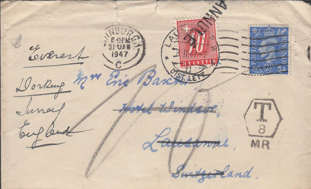 1947 UNDERPAID MAIL UK TO SWITZERLAND. Envelope (slight faults) Edinburgh to Lausanne Switzerland with KGVI 2½d cancelled EDINBURGH 31 JAN 1947 with postage underpaid and Swiss 10c due cancelled LAUSANNE 8.2.47. and overstruck ANNULE. On reverse boxed "SURCHARGED OWING TO INSUFFICIENT POSTAGE PREPAID 2½D INSTEAD OF 3D. PLEASE ADVISE SENDER" cachet in purple. (Ref 86386).