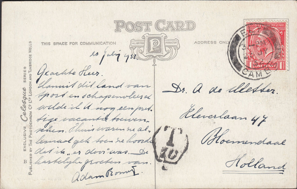 CAMBS. 1932 postcard Ely to Holland with KGV 1d cancelled neat ELY/CAMBS datestamp 23 JY 32, postage underpaid with "T/10" chargemark.  (Ref 87726).