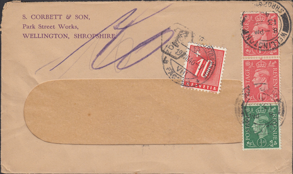 1946 UNDERPAID MAIL WELLINGTON (SHROPS) TO SWITZERLAND. Window envelope Wellington Shropshire to Switzerland with KGVI ½d and 1d x 2 cancelled WELLINGTON/SHROPSHIRE date stamps 13 AU 46. Postage underpaid with Swiss 10 postage due cancelled ZURICH 19.VIII.46. (Ref 91337).
