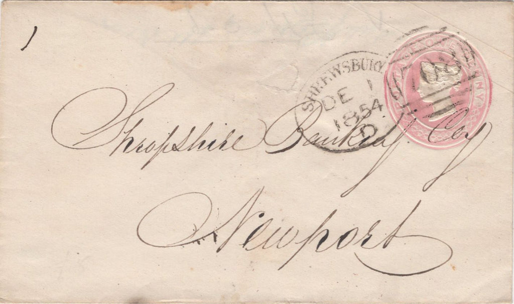 1854 1D PINK ENVELOPE SHREWSBURY TO NEWPORT WITH 'SHREWSBURY/708' TYPE A SPOON (RA116). 1d pink envelope from Shrewsbury to 'Shropshire Banking Co, Newport', very small soil at top and closed spike hole, cancelled fine to very fine strike 'SHREWSBURY/708' type A spoon (RA116) DE 1 1854, code 'D'. (Ref 130015).