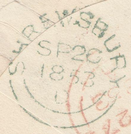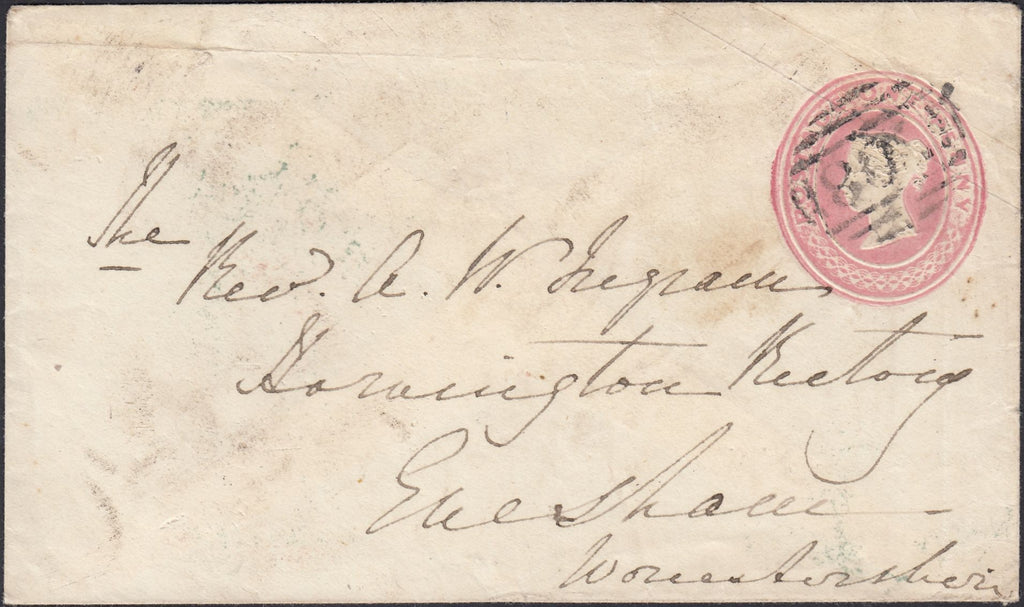1853 1D PINK ENVELOPE BRAMPTON BRYAN, HEREFORDSHIRE TO EVESHAM WITH 'BRAMPTON-BRYAN' UDC (HF14). 1d pink envelope, some soiling, from Brampton Bryan in Herefordshire to 'The Revd. A. W. Ingram, Harvington Rectory, Evesham, Worcestershire' cancelled '708' numeral of Shrewsbury. On reverse fair strike 'BRAMPTON-BRYAN' udc in blue-black (HF14) and 'SHREWSBURY' date stamp SP 26 1853. (Ref 131596).