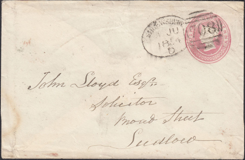 1854 1D PINK ENVELOPE BRAMPTON BRYAN, HEREFORDSHIRE TO LUDLOW WITH 'BRAMPTON-BRYAN' UDC (HF14) AND 'SHREWSBURY/708' SPOON (RA116). 1d pink envelope, slight soiling, from Brampton Bryan in Herefordshire to 'John Lloyd Esqr., Solicitor, Broad Street, Ludlow' cancelled fair strike 'SHREWSBURY/708' spoon type 'A' (RA116) 8 JU 1854 code 'D'. On reverse fair strike 'BRAMPTON-BRYAN' udc in dark blue (HF14) and 'LUDLOW' date stamp JU 9 1854. Month of spoon usage unrecorded by Arundel/Taylor. (Ref 131598).