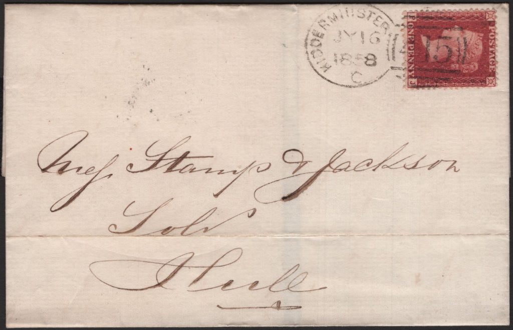 1858 MAIL KIDDERMINSTER TO HULL WITH 1D (SG40) 'KIDDERMINSTER/415' SPOON (RA44). Fine wrapper Kidderminster to 'Mefsrs Stamp and Jackson, Solrs, Hull' with fine die 2 1d rose-red on white paper (SG40) lettered PJ tied very fine strike 'KIDDERMINSTER/415' original spoon (RA44) JY 16 1858 code 'C'. A very scarce and underated spoon THIS BEING THE LATEST KNOWN USAGE OF RA44. (Ref 141063).