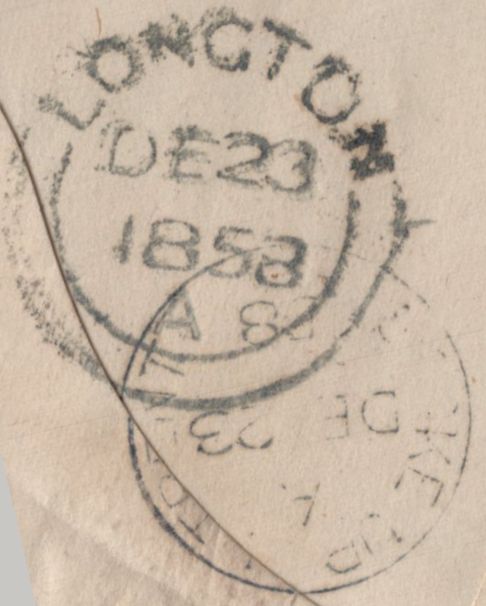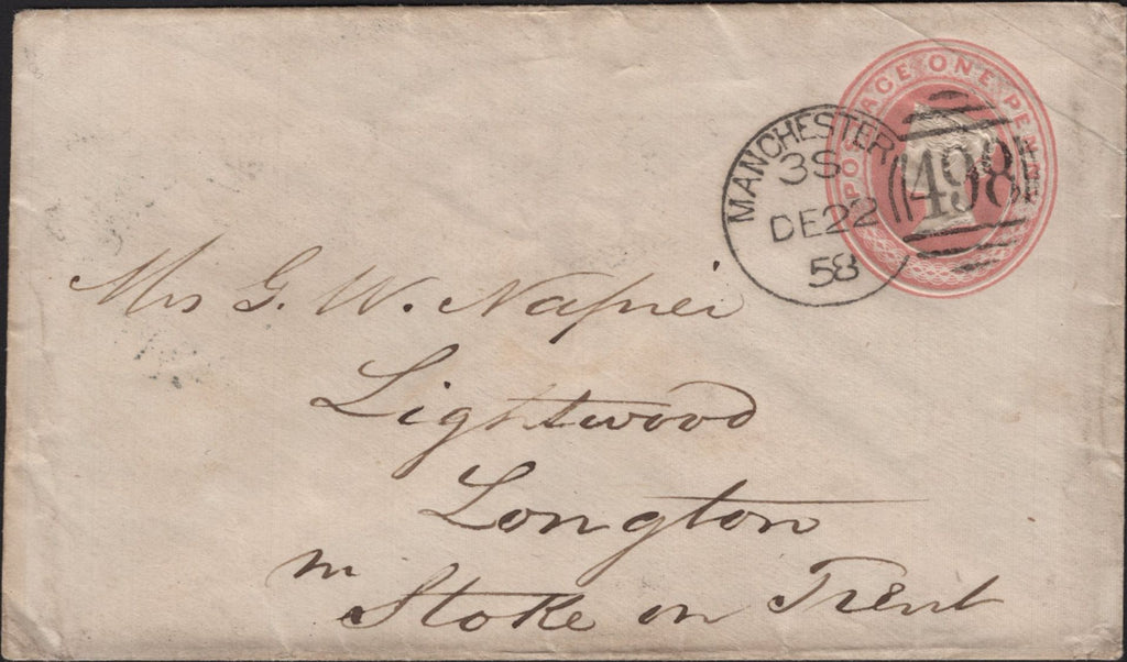 1858 1D PINK ENVELOPE MANCHESTER TO STOKE WITH 'MANCHESTER/498' SPOON TYPE D3 SECOND RE-CUT (RA84). Fine 1d pink envelope Manchester 'Mrs G.W. Napier, Lightwood, Longton, nr Stoke on Trent' with very fine strike 'MANCHESTER/498' spoon type D3 second re-cut (RA84) DE 22 58. code 3S. On reverse 'LONGTON' date stamp DE 23 1858. (Ref 142097).