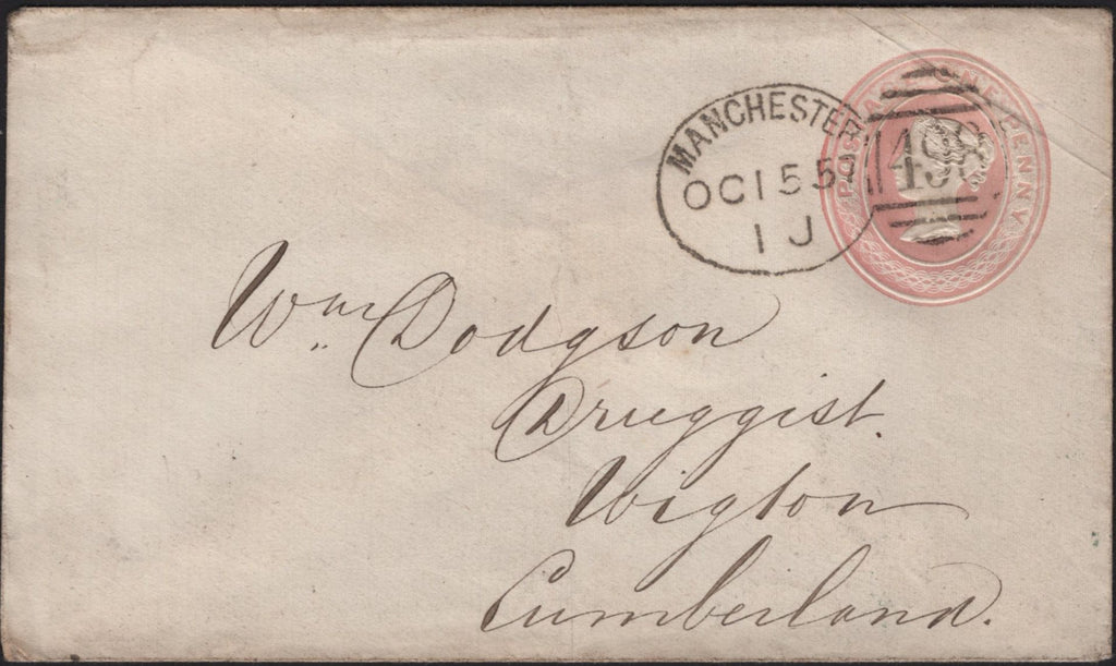 1857 1D PINK ENVELOPE MANCHESTER TO WIGTON, CUMBERLAND 'MANCHESTER/498' SPOON TYPE B (RA73). Penny pink envelope Manchester to 'Wm Dodgson, Druggist, Wigton, Cumberland' cancelled fine to very fine strike 'MANCHESTER/498' spoon type B (RA73) OC 15 57 codes 1J. (Ref 142113).