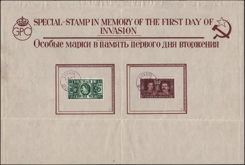 1944 GERMAN PROPAGANDA FORGERY, PRESENTATION SHEET 'SPECIAL-STAMP IN MEMORY OF THE FIRST DAY OF INVASION' WITH ½D SILVER JUBILEE AND 1½D CORONATION FORGERIES WITH SPECIAL CANCELLATION. A fine example of the 1944 German Propaganda Forgery presentation sheet entitled 'CROWN/GPO SPECIAL-STAMP IN MEMORY OF THE FIRST DAY OF INVASION STAR/SICKLE', 272 x 185mm, with very fine 'used' examples of the German Propaganda Forgeries of the GB KGV ½d Silver Jubilee stamp and the KGVI 1½d Coronation stamp each cancelled very fine strike 'LONDON/SPECIAL-STAMP/AAAO' (Allied Army Amphibian Operation) hand stamp 6 JUN 44 (D-Day!). As usual vertical and horizontal folds but well clear of 'stamps'. Very scarce. (Ref 141229).