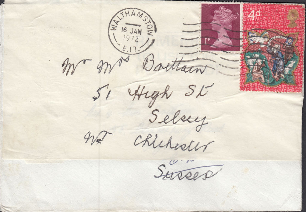 1972 DECIMAL AND PRE-DECIMAL COMBINATION ON COVER. Reused envelope Walthamstow to Selsey Sussex with 1970 4d Christmas (SG838) and 1p Machin cancelled WALTHAMSTOW 16 JAN 1972. (Ref 113419).