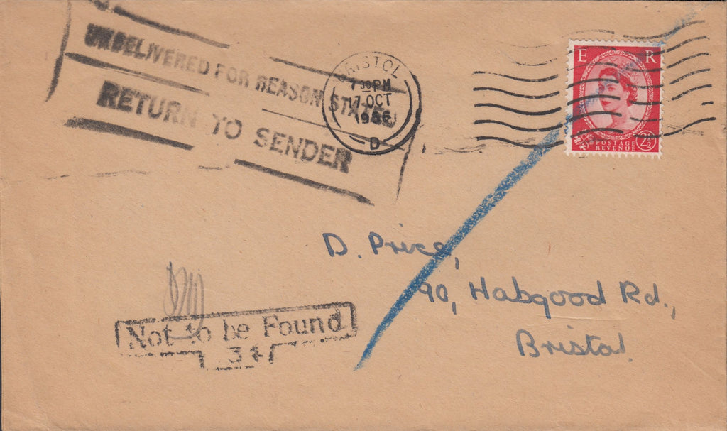 1956 UNDELIVERED MAIL USED IN BRISTOL. Envelope used locally in Bristol with 2½d Wilding cancelled BRISTOL 17 OCT 56. Undelivered with boxed 'Not to be Found/134' hand stamp also boxed 'UNDELIVERED FOR REASON STATED/RETURN TO SENDER' cachet. (Ref 114896).