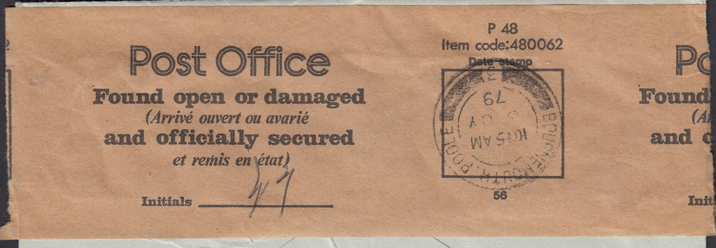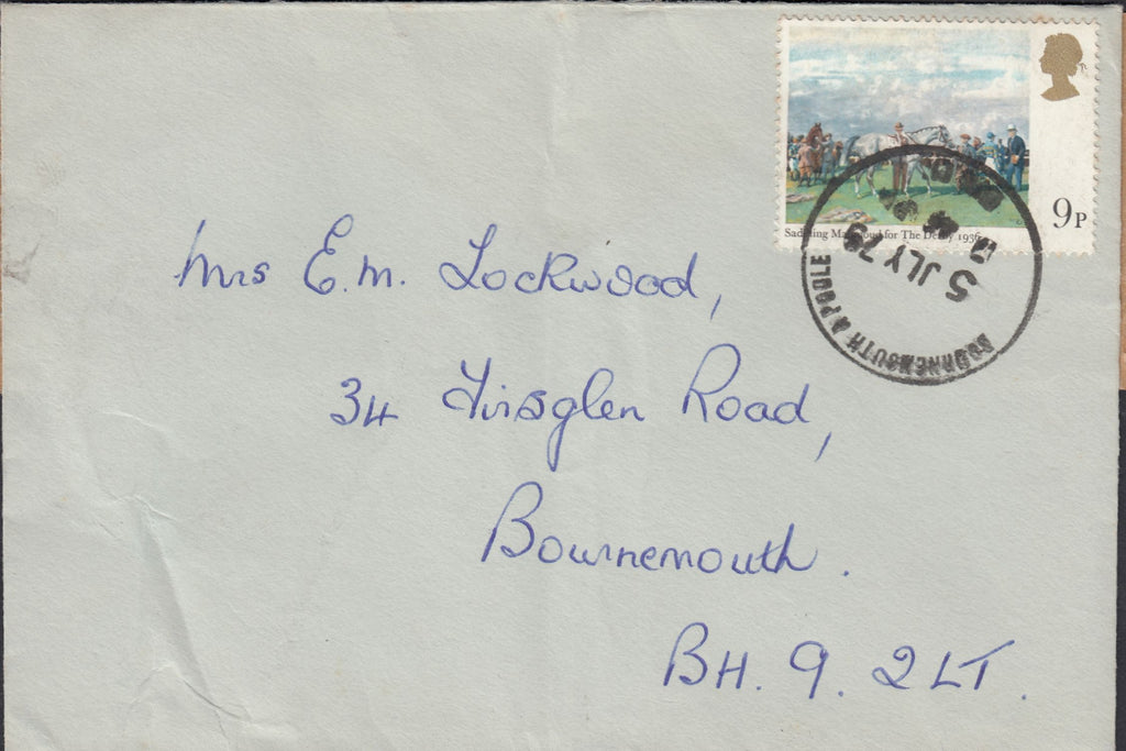 1979 "POST OFFICE FOUND OPEN OR DAMAGED ..." LABEL. Envelope used locally in Bournemouth with 9p Horse Racing Paintings "Saddling Mahmoud" used within Bournemouth and cancelled 5 JLY 1979. On reverse fine "Post Office/Found open or damaged and officially secured" label, cancelled BOURNEMOUTH.POOLE 6 JY 79. (Ref 114915).