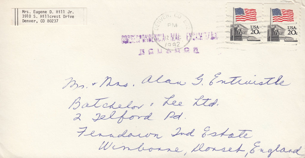 1982 MAIL USA TO DORSET MISDIRECTED TO ECUADOR. Envelope US to Wimborne Dorset with US 20c x 2 cancelled DENVER 12 DEC 1982, misdirected with good strike (in Spanish) "CORRESPONDENCE MISDIRECTED TO ECUADOR". (Ref 115328).