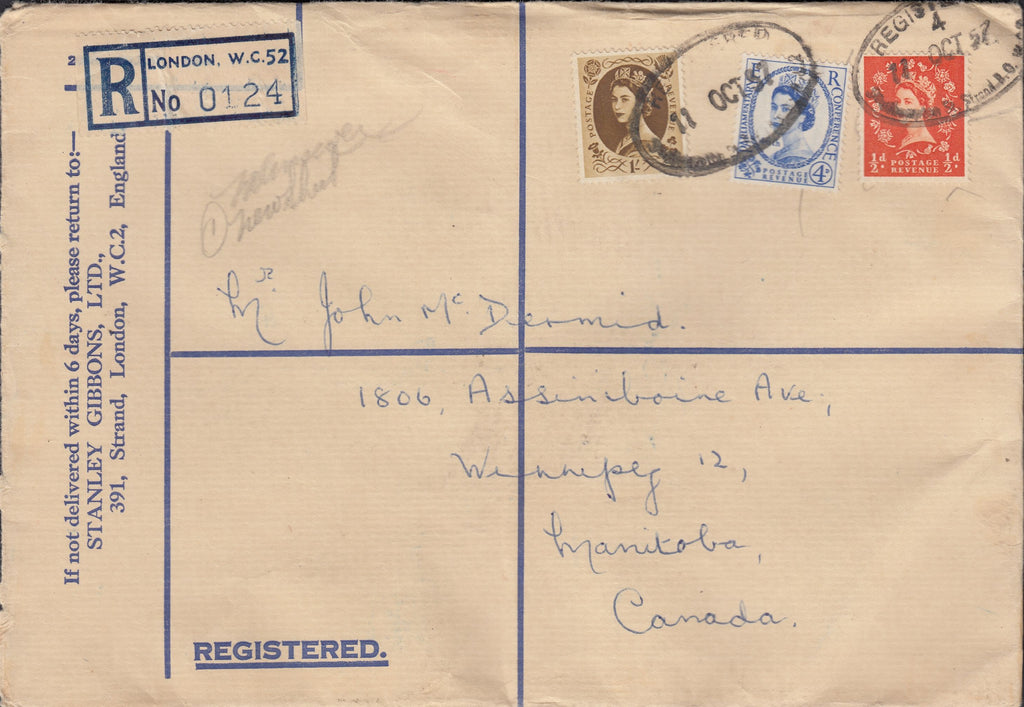 1957 REGISTERED MAIL LONDON TO CANADA. Fine SG registered envelope London to Manitoba Canada uprated with Wildings 1/- and ½d, also 4d "46th Inter-Parliamentary Conference" (SG560) cancelled 11 OCT 57. Unusual franking. (Ref 115704).