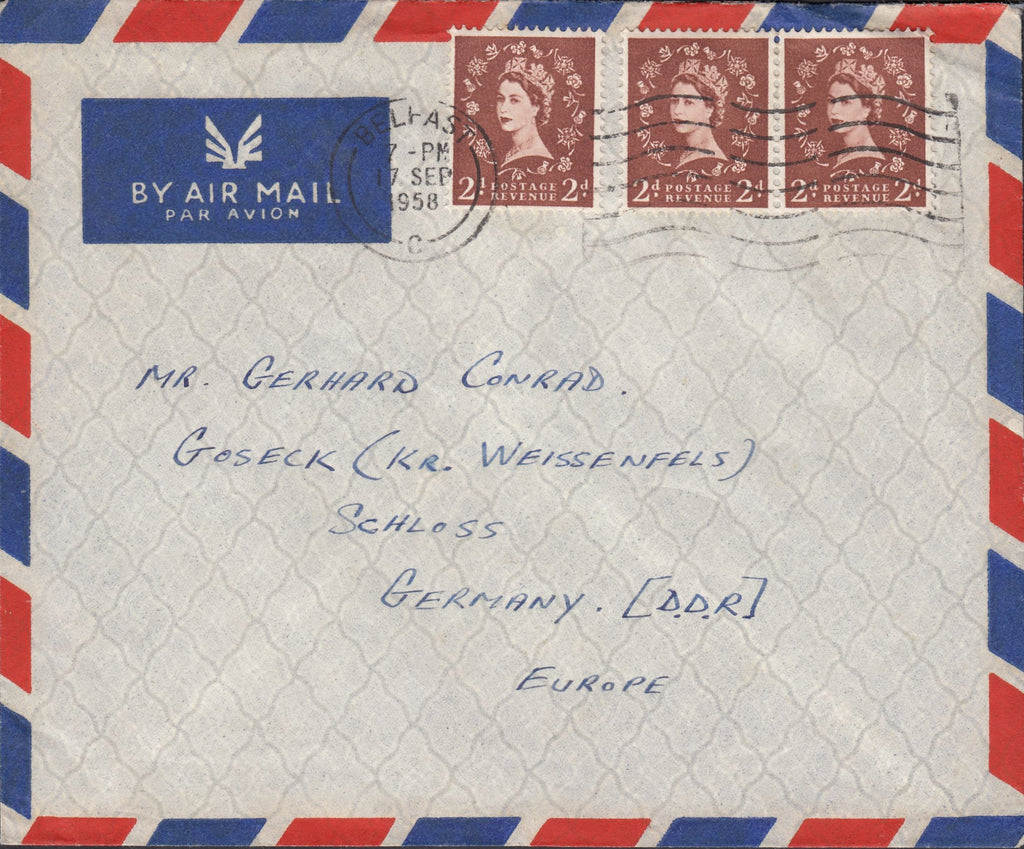 1958 MAIL BELFAST TO GERMANY (D.D.R). Air mail envelope Belfast to Germany Europe with Wilding 2d x 3 cancelled BELFAST 17 SEP 1958. (Ref 118315).
