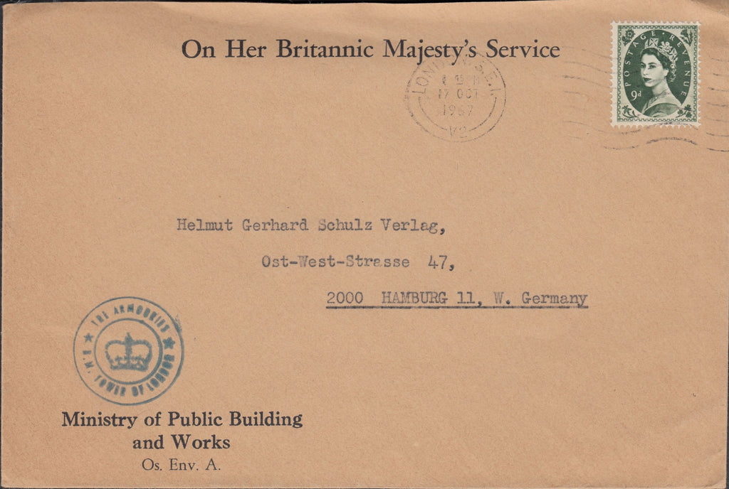 1967 MAIL LONDON TO HAMBURG. Envelope London to Hamburg West Germany with 9d Wilding cancelled LONDON 17 OCT 1967. At lower left fine circular cachet (25mm) 'THE ARMOURIES/TOWER OF LONDON/CROWN'. (Ref 118503).