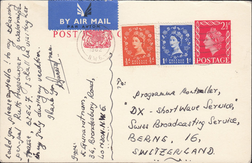 1962 2½D CARMINE POST CARD UPRATED TO SWITZERLAND. 2½d carmine post card with Coat of Arms London to Berne Switzerland uprated with Wildings ½d and 1d cancelled KILBURN 28 MAY 1962. (Ref 118638).