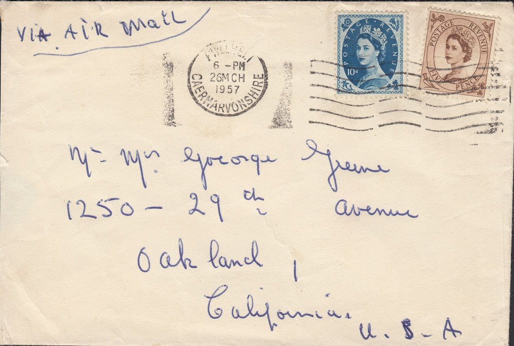 1957 MAIL PWLLHELI TO USA/WILDINGS. Envelope sent air mail Pwllheli to California with Wildings 10d and 5d cancelled PWLLHELI/CAERNARVONSHIRE 26 MCH 1957. (Ref 118643).