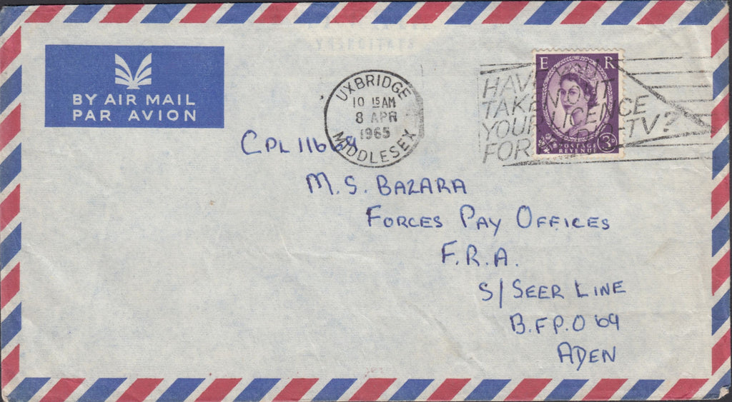 1965 MAIL UXBRIDGE TO ADEN. Air mail envelope Uxbridge to B.F.P.O.69 Aden with 3d Wilding cancelled UXBRIDGE/MIDDLESEX 8 APR 1965. Scarcer destination. (Ref 118660).