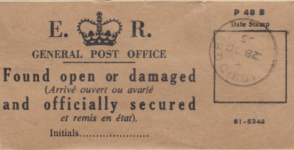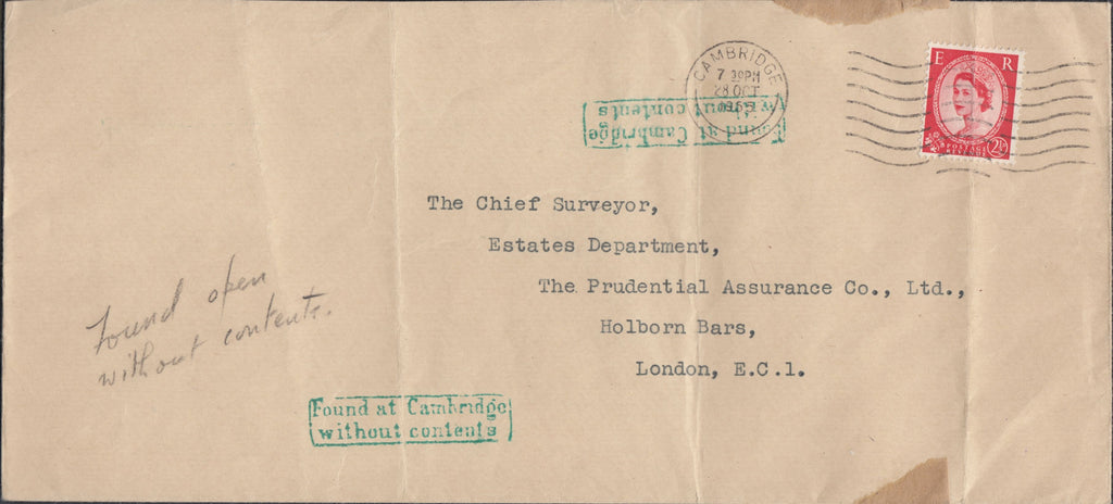 1955 MAIL CAMBRIDGE TO LONDON WITH 'FOUND AT CAMBRIDGE WITHOUT CONTENTS' INSTRUCTIONAL. Envelope, 228 x 104 from Cambridge to London with Wilding 2½d cancelled 'CAMBRIDGE' 28 OCT 1955. On front two fine strikes boxed hand stamp 'Found at Cambridge/without contents' both struck in green and on reverse fine 'E.CrownR./GENERAL POST OFFICE/Found open or damaged and officially secured' sealing tape cancelled CAMBRIDGE 28 OC 55. Some creasing. (Ref 118856).
