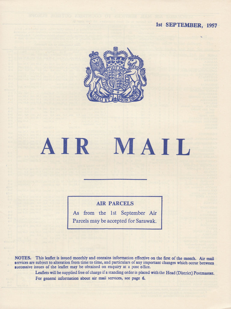 1957 'AIR MAIL' G.P.O. PAMPHLET. A very fine six page pamphlet dated 1st September 1957 with excellent information on Air Mail services including 'SURCHARGE AIR MAIL SERVICES TO COUNTRIES OUTSIDE EUROPE', 'EUROPE-LETTER MAIL', and 'EUROPE-AIR PARCELS'. (Ref 119398).